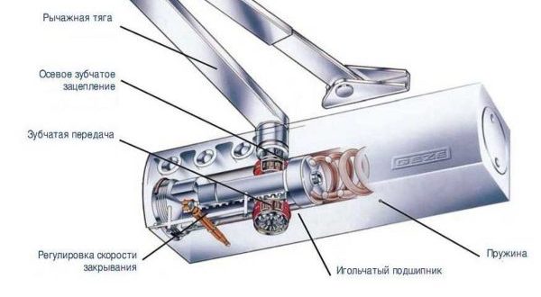 Чтобы двери не оставались открытыми, раньше использовали банальную пружину, сегодня ставят дверной доводчик. В основе его конструкции тоже лежит пружина, но она более мощная, спрятана в металлический корпус и