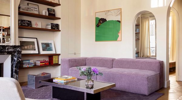 Светлый фон, красочные детали и немножко творчества — эта небольшая квартира в Париже оставляет очень приятное впечатление. Лиловый диван и ковёр такого де цвета в гостиной сразу настраивают