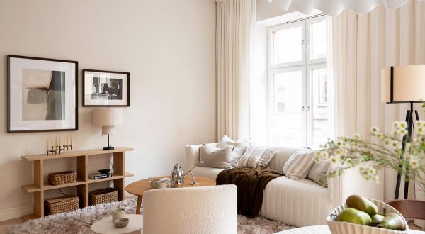 Дизайнеры этой квартиры в Гетеборге обернули лаконичный скандинавский минимализм в приятную оболочку из кремовых оттенков. Шторы, текстиль, цвет стен и мебели — интерьер практически монохромный, но в этом