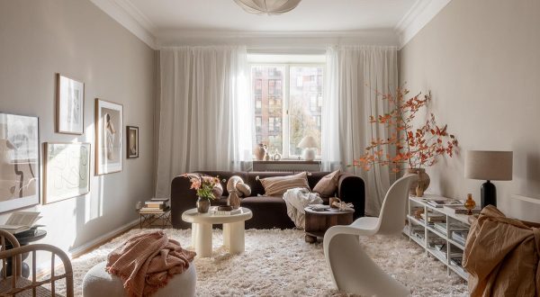 Каждая комната в этой шведской квартире имеет свой собственный характер, вдохновлённый порой года. Так, в гостиной отчетливо чувствуется настроение осени: в цвете обивки дивана, в композиции из веток