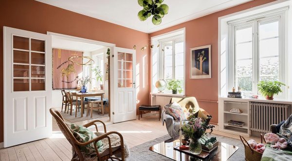 В интерьере этой замечательной шведской квартиры в первую очередь бросается в глаза цвет стен в гостиной — это красивый терракотовый оттенок, который всегда ассоциируется с летом и солнцем.