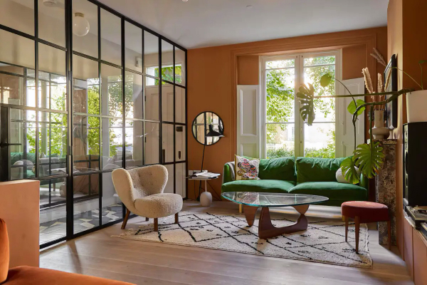 Эффектная гостиная этого таунхауса в Лондоне со смелыми терракотовыми стенами и стеклянной перегородкой по характеру очень напоминает современные скандинавские интерьеры. Но роскошное викторианское окно со ставнями и элегантный камин, отделанный тёмным камнем, тонко намекают, что это всё-таки прекрасный исторический таунхаус в Англии, просто с недавно обновлёнными интерьерами. Стоит отметить, что дом не очень большой, но помещения компактные и уютные — взять хотя бы кухни с выходом на задний двор и спальню в зелёном цвете на верхнем этаже. Enjoy!