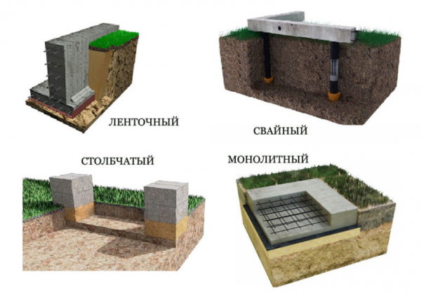 Фундаменты могут отличаться материалами, которые используются для их возведения, глубиной, а также способом исполнения. Именно по способу исполнения разделяют их виды: