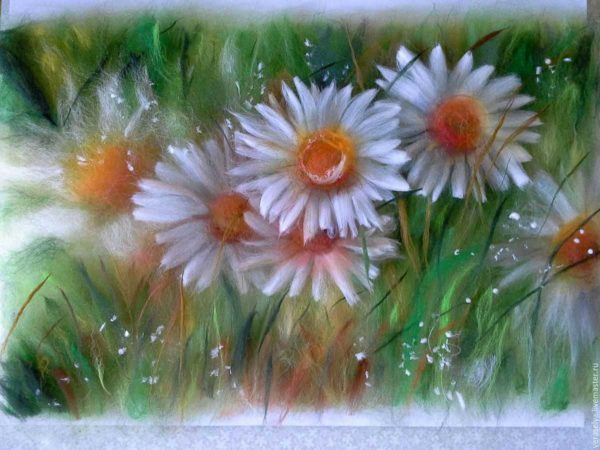 Нечасто мы можем видеть картины и панно из войлока. Он вообще в последние годы стал диковиной, как и изделия из него. Шляпы и какие-то другие мелкие вещи воспринимаем нормально, а вот войлочные картины точно встречаются редко. Так что описывая картины из необычных материалов, начнем, пожалуй, именно с войлока. Для начала можно сделать пейзаж, цветы. Они проще реализуются. С опытом можно делать все более интересные панно.