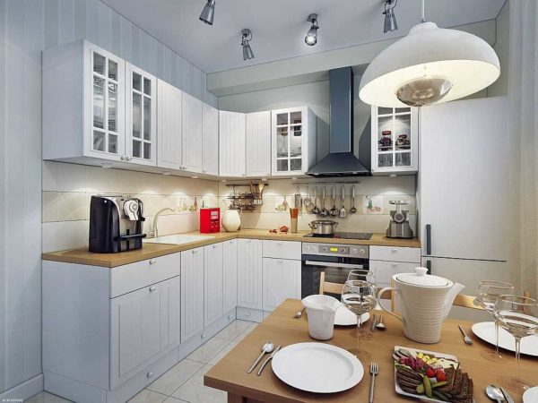 Но зонированное освещение кухни не исключает наличия люстры. Функциональное значение ее невелико, так как световое пятно получается в центре помещения, которое в основном остается пустым. Но с точки зрения выравнивания неравномерной освещенности такой способ очень неплох. Как вариант можно использовать несколько софитов, как на фото выше, или установить встроенные потолочные светильники, если потолок натяжной или подвесной из гипсокартона.