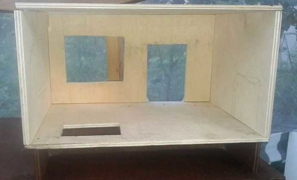 Вырезать окна в фанере, ОСП, да и в любом другом материале, не такая уж проблема. Для начала при помощи дрели и сверла делают отверстие, в которое можно пропустить полотно пилы. Далее — дело техники. Вырезанное отверстие шлифуют, доводя до гладкости, а потом надо сделать так, чтобы сделанные дырки были похожи на окна. Для этого нужны рамы, шторы. При желании можно сделать и стекло — из прозрачных пластиковых бутылок.