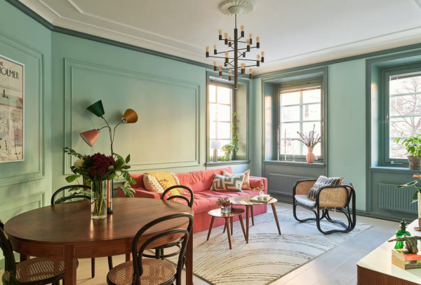 Несмотря на совсем небольшую площадь этой шведской квартиры, дизайнеры не постеснялись пойти на эксперименты с цветом в её оформлении — благо угловое расположение наполняет интерьер достаточным количеством естественного света через окна на двух стенах. Так, гостиная и спальня здесь оформлены в необычных оттенках зелёного, и этом при классических молдингах и оконных обрамлениях. К тому же, в качестве цветового акцента был выбран диван в неожиданной розовой оббивке — получилось не только смело, но и эффектно. Вот такой интересный вариант дизайна небольшой квартиры!