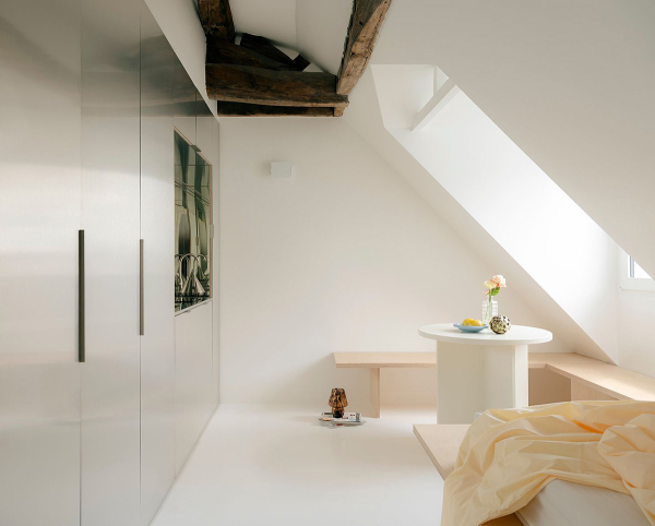 Эта крошечная квартира площадью всего 18 кв. м является результатом современной переделки тёмного помещения под крышей старого Османовского дома в центре Парижа, где раньше размещались комнаты прислуги. Несмотря на наличие всего одного окна, интерьер дарит хозяину очарование скошенных потолков и виды на знаменитые крыши города. Пространство кажется лёгким и воздушным благодаря почти полностью белому оформлению и минималистичному подходу к дизайну. Отличный вариант жилья для краткосрочной аренды!