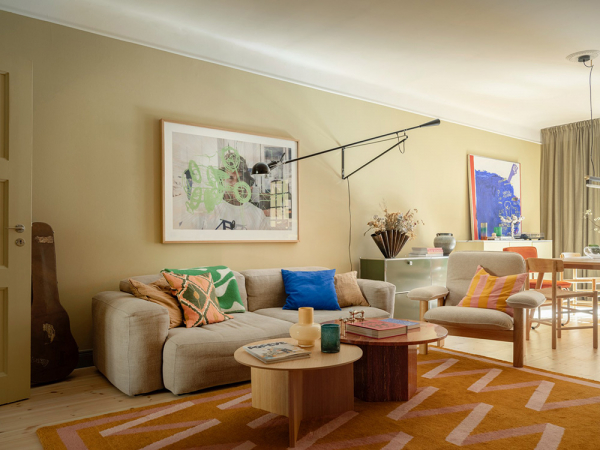 Интерьеры этой шведской квартиры получились смелыми и необычными, в то же время тёплыми и уютными. Песочные оттенки в последнее время часто встречаются в скандинавский и не только интерьерах, и здесь они также добавили необычное свежего настроения. С другой стороны в декоре можем видеть много ярких деталей: пёстрый ковер, красочные подушки, крупноформатные постеры, книги и текстиль. Enjoy!