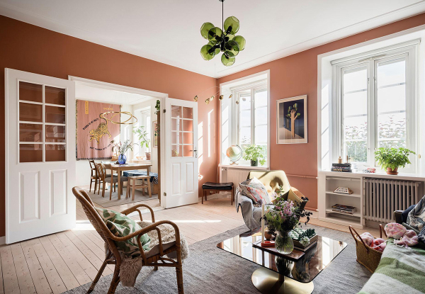 В интерьере этой замечательной шведской квартиры в первую очередь бросается в глаза цвет стен в гостиной — это красивый терракотовый оттенок, который всегда ассоциируется с летом и солнцем. И действительно, в сочетании с белыми окнами и красивой двустворчатой дверью, также ласковым естественным освещением, пространство дарит лишь самые приятные эмоции. Кроме этого, обильный настенный декор и яркий текстиль дополняют общую картину жизнерадостными нотками. Но интересные цветовые решения не заканчиваются на этом — спальни также получилось очень яркими и даже сочными. Enjoy!