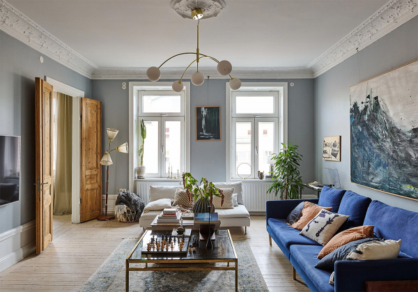Винтажные детали стали объединяющим элементом в дизайне интерьеров этой просторной квартиры в историческом доме в Стокгольме. Гостиная оформлена в свежих оттенках синего, а главным цветовым акцентом всего дома является, безусловно, ярко-синий диван. В этом интерьере имеются уникальные двустворчатые двери из винтажного дерева — смотрятся они очень выразительно, а также добавляют приятных тёплых ноток. Цветовая гамма кухни и хозяйской спальни оливково-бежевая — здесь также винтажный декор придаёт характера и очарования пространству. Красота!