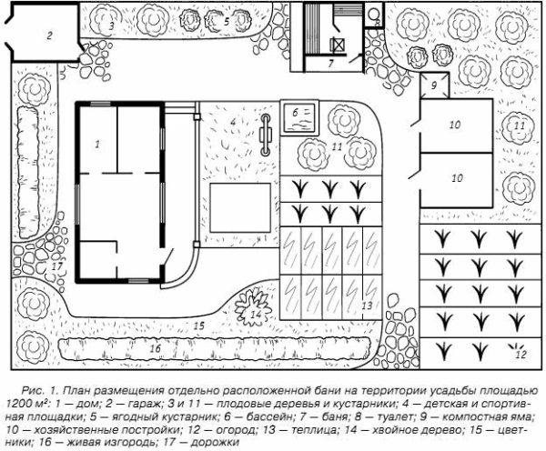 Согласно требованиям СНиП и СП, баня на участке ИЖС или СНТ должна располагаться на определённом расстоянии как от забора, так и от жилых и хозяйственных построек, источников водоснабжения и других объектов.