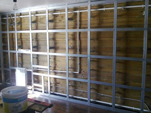 При сборке каркаса на сплошной стене расстояние между стойками должно быть не менее 60 см. Тогда получается, что каждый лист крепится к трем вертикальным профилям: два по краям и один в середине. При этом край листа приходится на середину профиля.