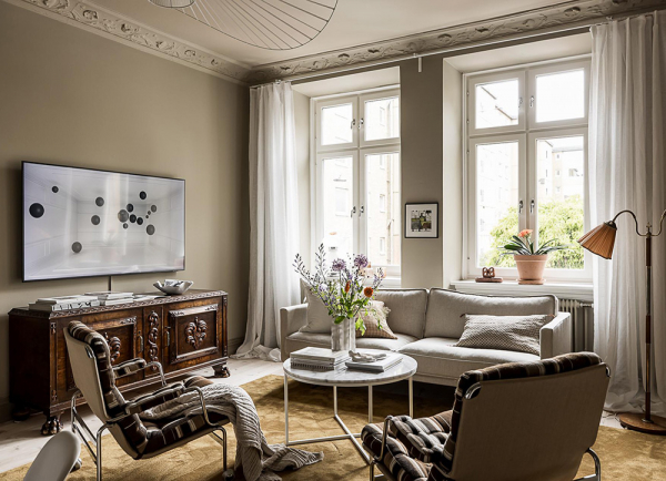 Необычные цвета стен и потолков сделали интерьер этой квартиры в Гётеборге таким эффектным и стильным. Дизайнеры использовали много бежевого цвета, но благодаря тонкому подбору более глубоких и атмосферных оттенков пространство выглядит как с обложки модного интерьерного журнала. В спальной — не менее интересные и эффектные зеленые стены в сочетании с бежевым потолком с классической лепниной. Отличный пример того, какие чудеса может творить умелая работа с цветом!