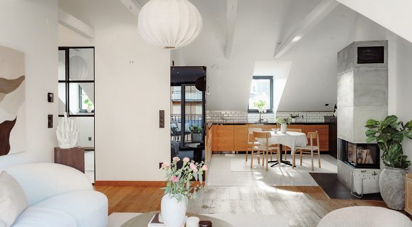 Благодаря большим окнам на две стороны, эта мансардная квартира под крышей в Стокгольме получает приличное количество естественного света, а стеклянные межкомнатные перегородки позволяют ему прекрасно распространяться по интерьерам.