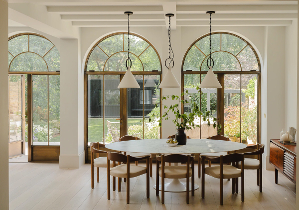 Замечательная архитектура этого дома на западе Лондона, а точнее изумительные арочные окна, через которые виднее чудесный сад на заднем дворе, стали главным вдохновением для дизайна его интерьеров. Так, в оформлении внутренних пространств мы можем видеть арочные проёмы между комнатами, детали мебели скруглённых форм и другой декор, которые визуально перекликаются с архитектурными особенностями дома. Кстати, дом был построен недавно, поэтому в его дизайне преобладает лёгкий современный вариант английского стиля. Enjoy!
