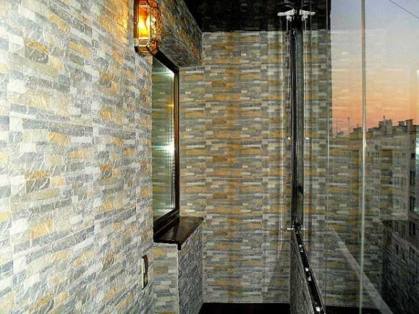 Второй по популярности материал — декоративный камень или клинкерная плитка под кирпич. Отделка балконов внутри этими материалами возможна и при холодном, и при теплом остеклении, а также вообще без него. Материал долговечен, легок в уходе, морозостоек, не разрушается под действием ультрафиолета. Так что неплохой выбор.